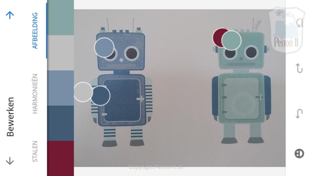 Afb.: screenshot van de app Adobe Capture, waarmee ik een foto maakte van het behang Robot van Perron 11. De app zoekt de kleuren uit het behang en geeft suggesties voor een kleurenschema dat je kunt aanpassen