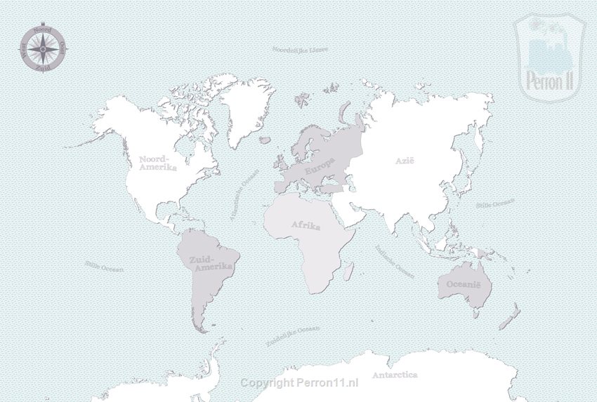Wereldkaart posterbehang met werelddelen en zeeën in het Nederlands. Het formaat van het hele behang is 400 x 270 cm. Het behang is bij te snijden tot minimaal 300 x 230 cm, dan staan alle werelddelen en zeenamen nog mooi in beeld (het compas valt dan wel weg). Wil je het behang toch liever op maat? Dat kan! Kies dan voor de optie aangepaste maat. We hebben dit wereldkaartbehang ook met illustraties en met extra opties!