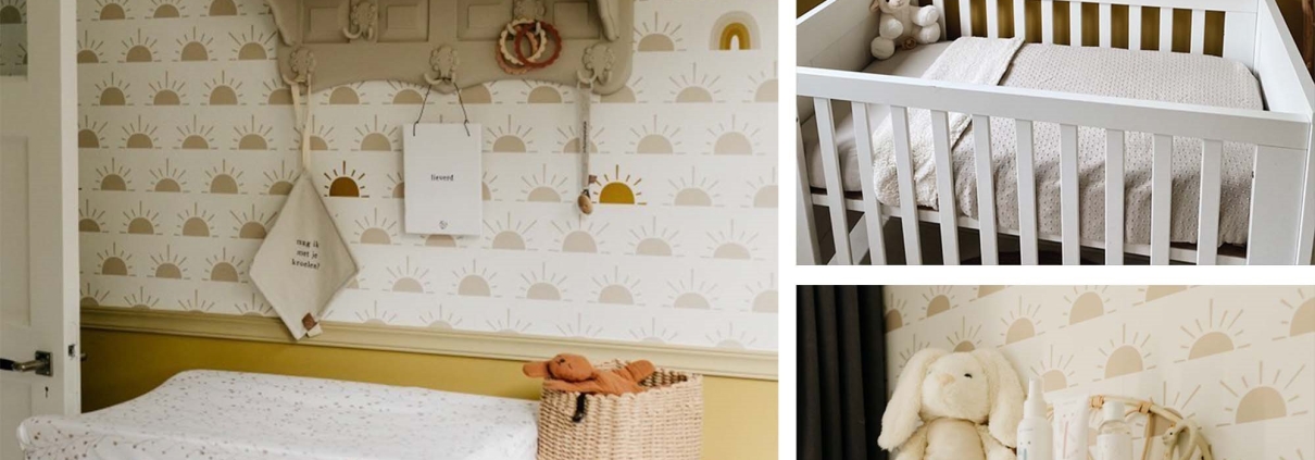 Een lambrisering in de kinderkamer is alweer jaren hartstikke hip. Zo’n lambrisering kun je natuurlijk schilderen, maar je kunt hem ook van behang maken en daarboven de wand dan schilderen. Maar als je het net een tikje anders wil, doe je het andersom: schilder het onderste deel van de wand en behang het bovenste deel van de wand. Hieronder zie je hoe een van onze klanten dat deed met ons behang Zon en Regenboog. Wat een toffe babykamer, vind je niet? Leuk om te weten: sinds kort kun je behalve onze standaard rollen behang ook speciale rollen voor het maken van een lambrisering bestellen. Superhandig, dan hoef je niet uit te rekenen hoe het dan zit met patroon- of rapporthoogte.
